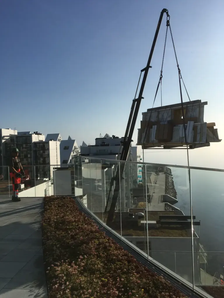 Vi klarer både mindre og helt store kranopgaver, hvor en kran-rækkevidde helt op til 42 meter kan komme i spil.